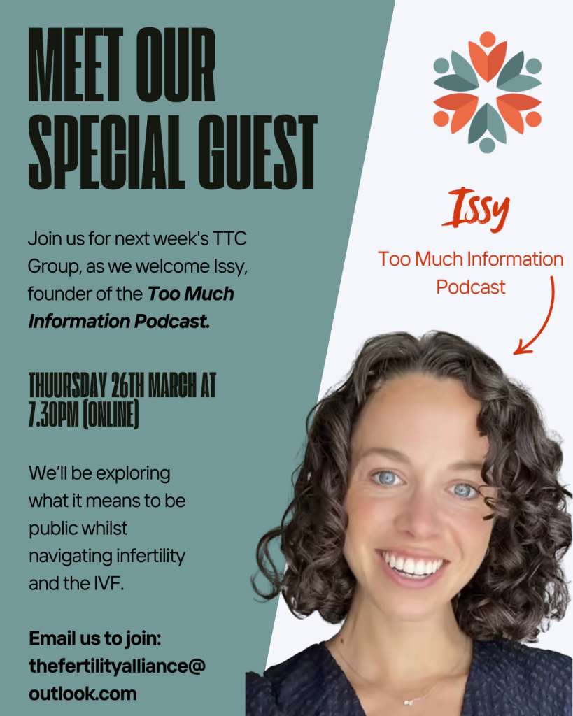 Come and join us on Tuesday 26 March, when we’ll have the wonderful Issy, founder of the @too.much.info.podcast, along with us to explore what it means to be public while navigating infertility and IVF.
